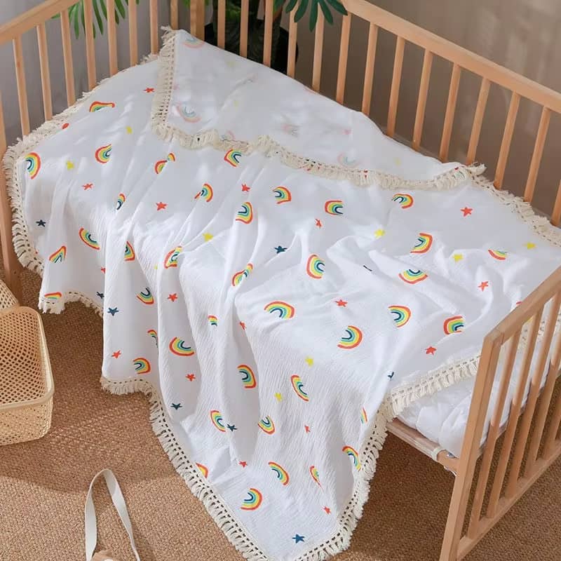 Muslin Fringe Trim Baby Blanket Daisy Rainbow Print Baby Soothing Blanket